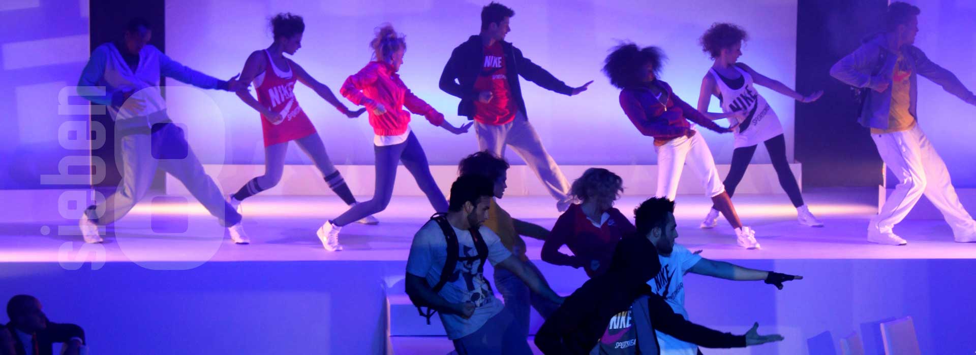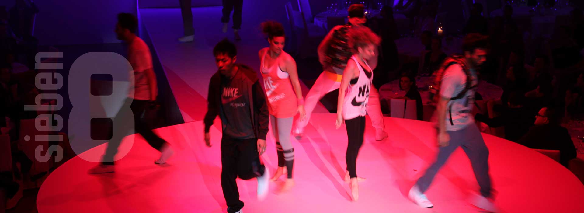 sieben8 launched Nike’s new 2010 autumn/winter collection with a colourful dance & fashion show at the famous Palais im Zoo venue in Frankfurt. A blend of a traditional-style fashion show, choreographed dance and acrobatics and a Michael Jackson medley, performed on a 22 m catwalk, were amongst the highlights of the event hosted by Nike Germany.